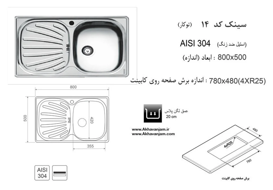 سینک 14 اخوان با کارکرد توکار در اندازه طول 80 سانت و عرض 50 سانتی متر می باشد.