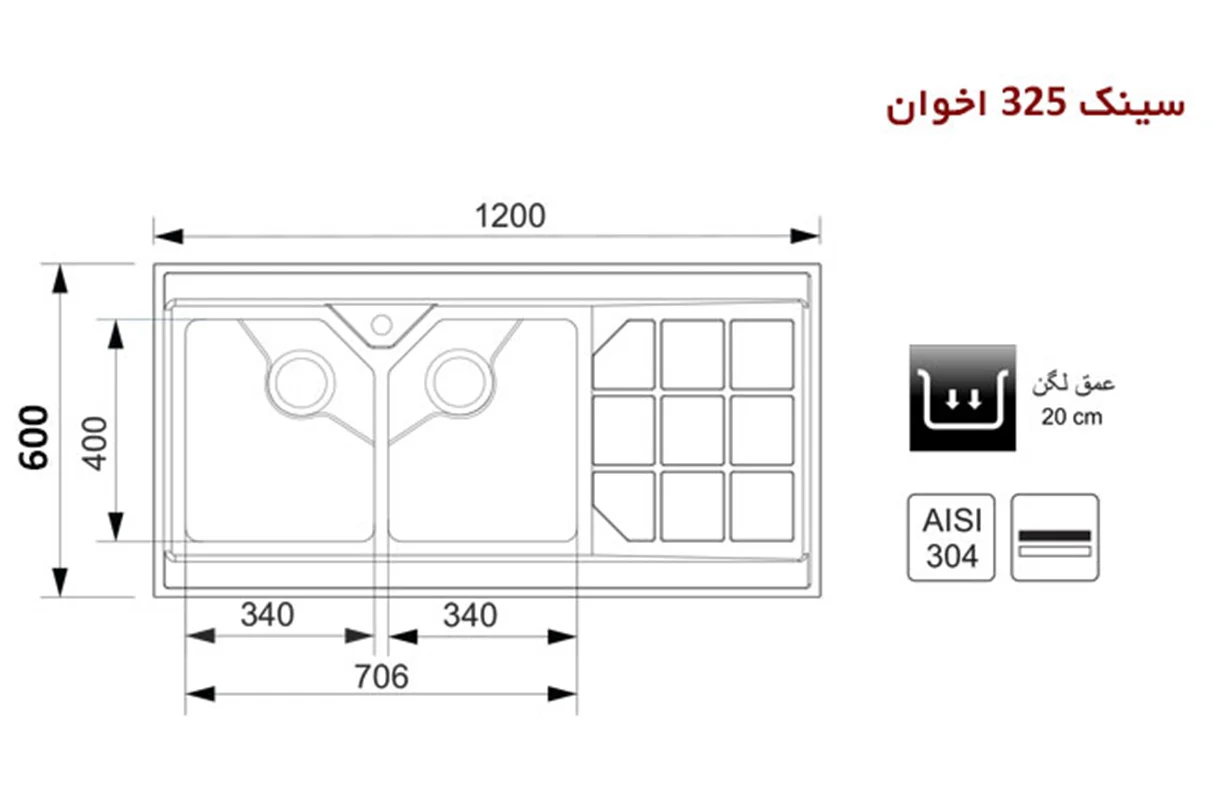 سینک 325 اخوان با کارکرد روکار در اندازه طول 120 سانت و عرض 60 سانتی متر می باشد.