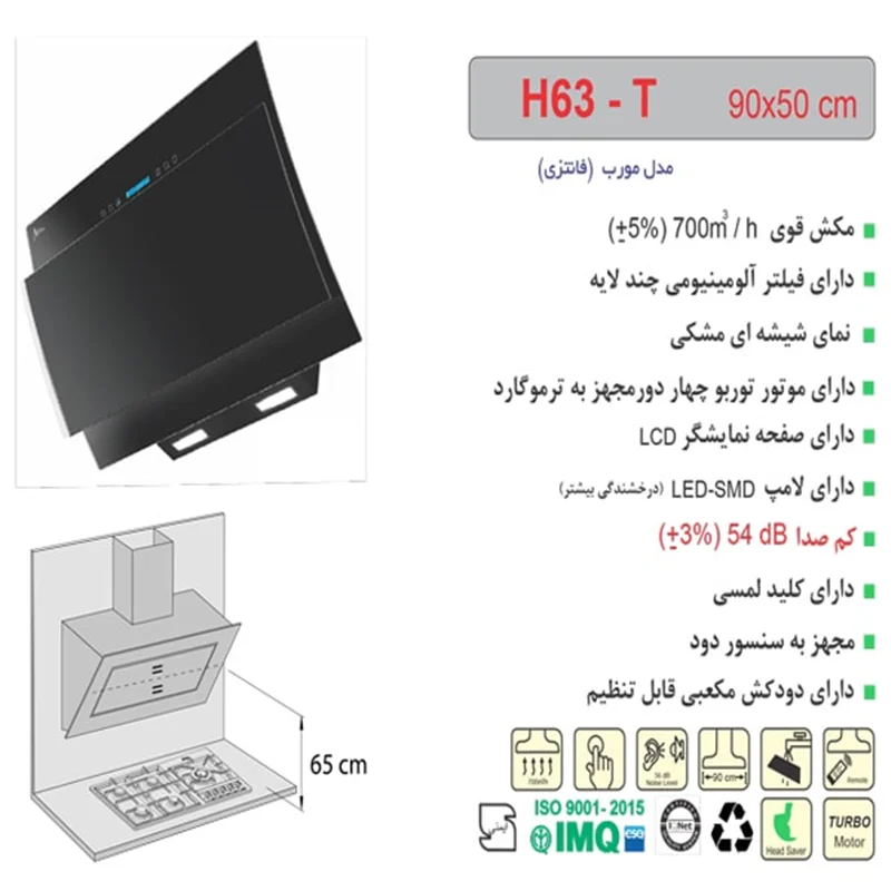 مدل محصول : هود آشپزخانه اخوان 63 موتور فلزی | Akhavan hood H63 Mf نمای ظاهری : شیشه مشکی نوع شیشه : سکوریت نشکن (مقاوم در برابر حرارت , ضربه ) صفحه نمایش : مجهز به صفحه نمایشگر LCD ابعاد خارجی هود : 90 در 50 سانتی متر تعداد دور موتور : موتور 4 دور با ترموگاد قدرت مکش : حدود 700 متر مکعب میزان صدا : حدود صدای موتور 56 DB دسیبل جنس حلزونی موتور : فلزی روشنایی : دارای لامپ SMD (درخشندگی بیشتر) باز شدن درب : جک دستی بر روی درب دارای صفحه کلید لمسی به همراه نمایشگر مجهز به سنسور تشخیص دود قطعات برقی شامل موتور , برد , کلید و لامپ هالوژن دارای استاندارد ملی یا CE می باشند مجهز به سیستم کنترل از راه دور مدت گارانتی : دارای 20 ماه ضمانت از زمان نصب به وسیله خدمات کارخانه اخوان